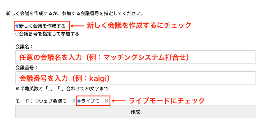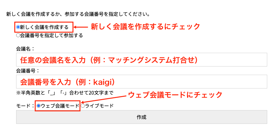 モードの「ウェブ会議モード」をチェックして「作成」をクリックするとウェブ会議が開始されます。