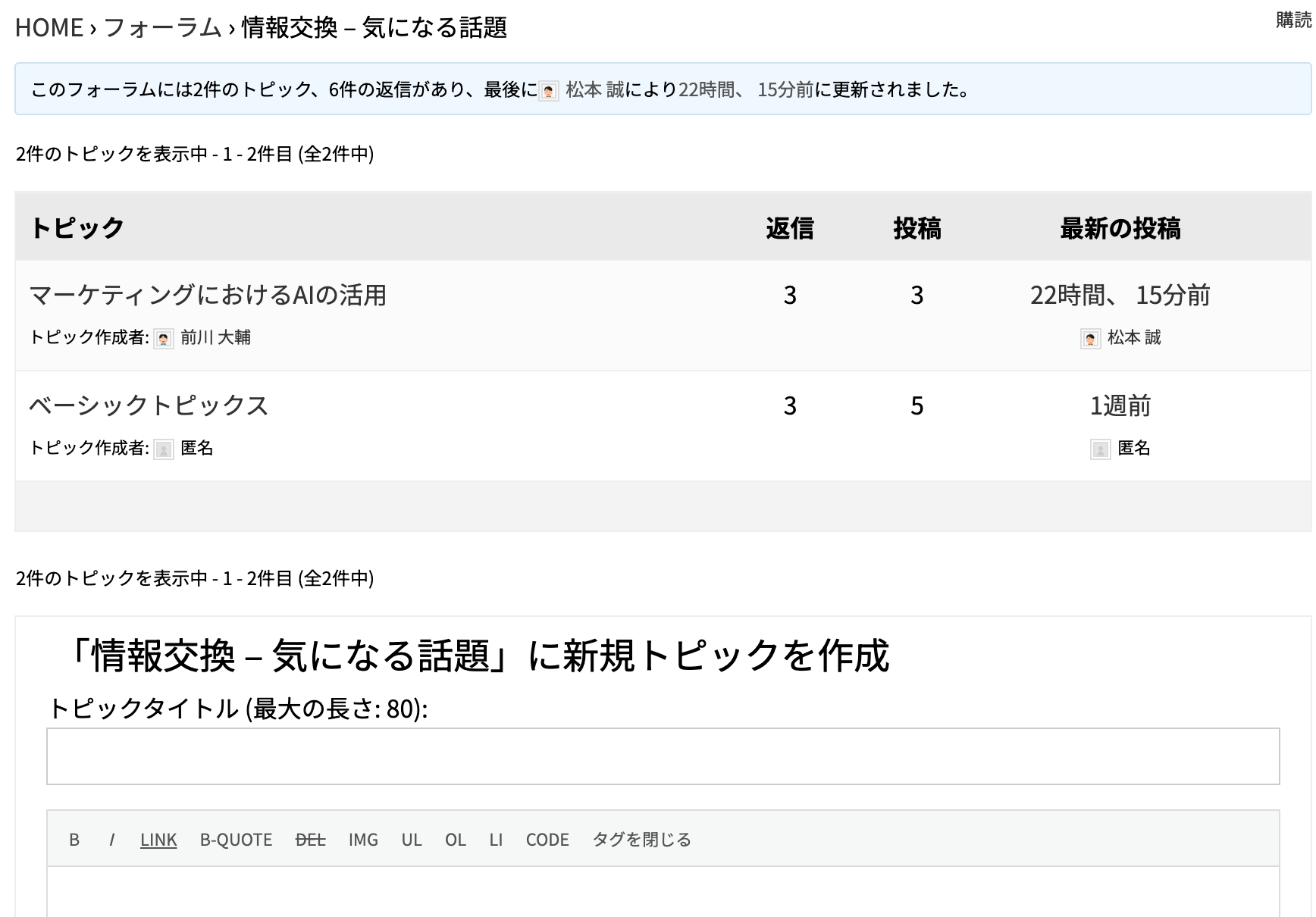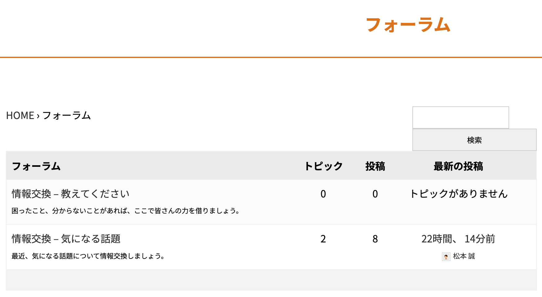 フォーラムをクリックするとフォーラムが表示されます。トピックがあれば一覧表示されます。ここからトピックを投稿できます。