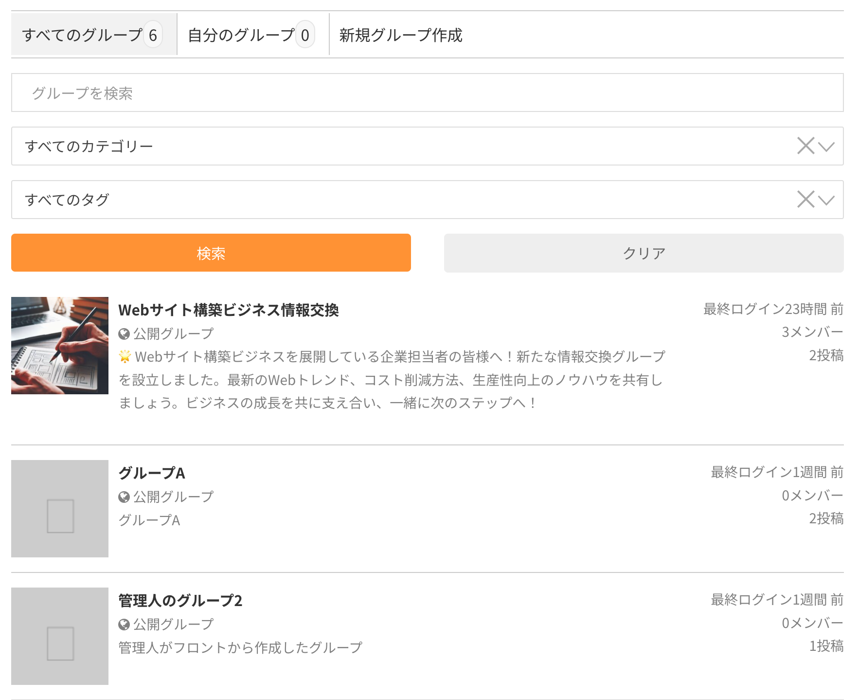 メニューの「グループ」をクリックするとグループの一覧が表示されます。グループが多数あるときは、任意のキーワードやカテゴリーで検索することができます。