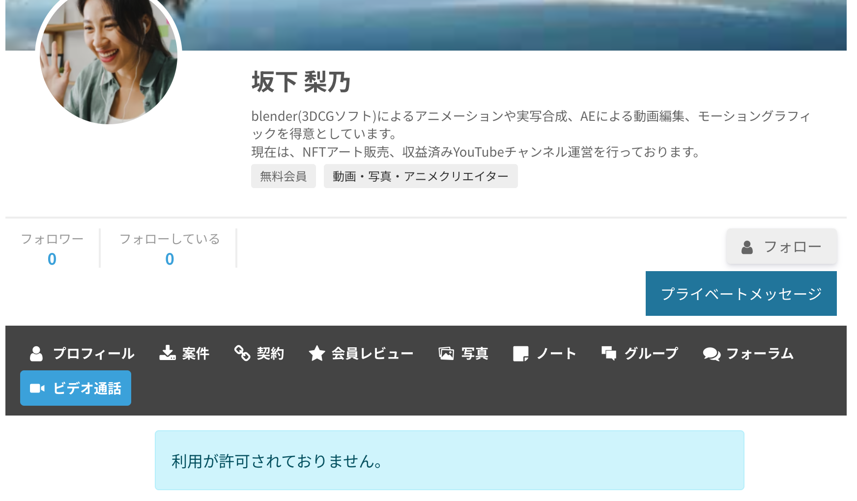 お互いが会員プロフィールから相手を呼び出すことでビデオ通話が可能になります。つながるまでは「許可されていません」と表示されます。または自分のプロフィールでビデオ通話タブを選択し、通話の許可をしてください。